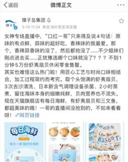 就在股价第一天涨停,即3月10日,该公司官微曾发微博表示:在女神专场直播中,“口红一哥”只来得及说4句话:原味的有点鲜,蒜味的超好吃,香辣味的我最爱。那个,香辣蒜香味的没了,然后都抢没了……不到1分钟5万份虾夷扇贝休闲零食售罄。