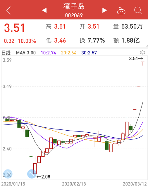 3月12日獐子岛迎来第三个一字涨停板,股价报收3.51元。
