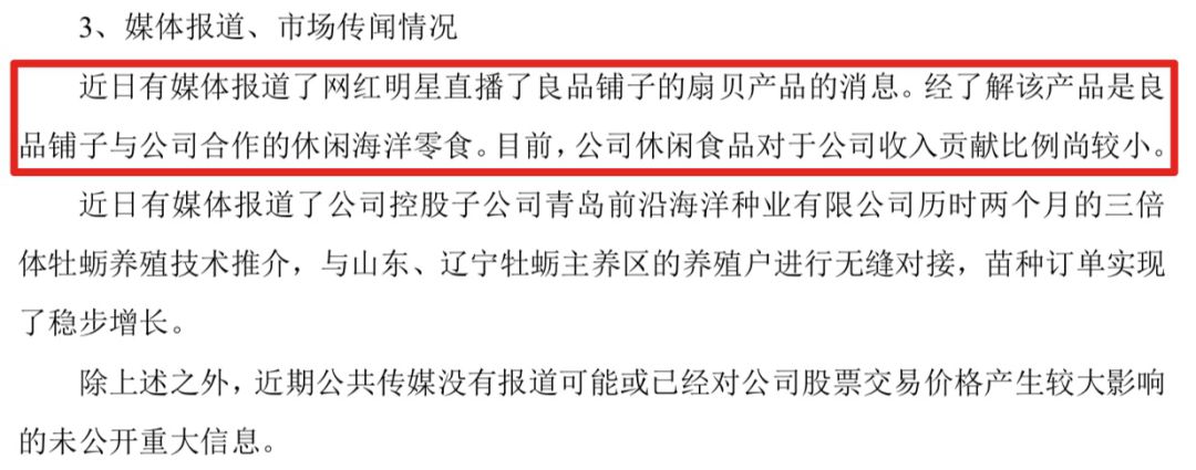 对于李佳琦直播带货,獐子岛也回应称,该公司休闲食品对于公司收入贡献比例尚较小。