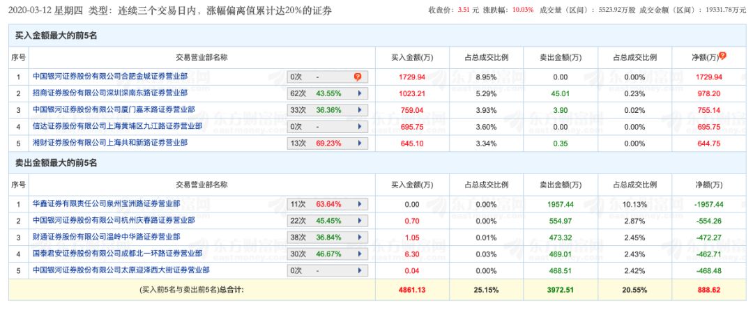 买入榜中,前五名合计买入4861.13万元:排名第一位是银河证券的合肥金城营业部,买入1728.94万;第二为招商证券的深圳深南东路营业部,买入1023.21万元。