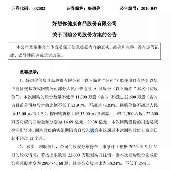 公告说了啥?好想你竟然要拿出最多近30亿来回购自家股票,然后注销,一出手就要回购43.83%的总股本!
