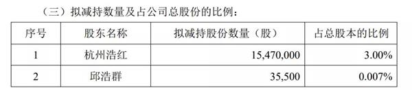 持股10.29%的股东杭州浩红实业有限公司计划减持公司股份数量不超过1547万股(占公司总股本比例3.00%),此外,公司董事兼副总经理邱浩群计划减持公司股份数量不超过3.55万股(占公司总股本比例0.007%)