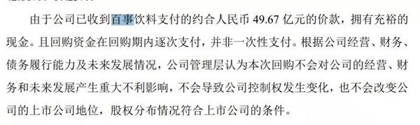 最新公告显示,由于公司已收到百事饮料支付的约合人民币49.67亿元的价款,拥有充裕的现金。且回购资金在回购期内逐次支付,并非一次性支付。