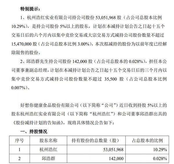 大比例回购的同时,好想你的两个股东发公告称要减持3%的股份。