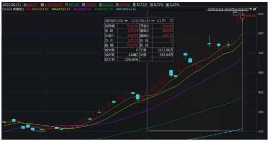 受优异的财报数据提振,特斯拉股价连创新高,1月30日单日涨幅超过10%。2020年以来,股价涨幅高达55.52%。