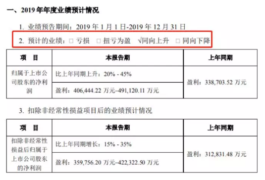 宁德时代2019年年度业绩预告显示,2019年归属于上市公司股东的净利润预计为40.64–49.11亿元,比上年同期上升20%-45%;扣非后归属上市公司股东的净利润为35.98-42.23亿元,比上年同期上升15%-35%。