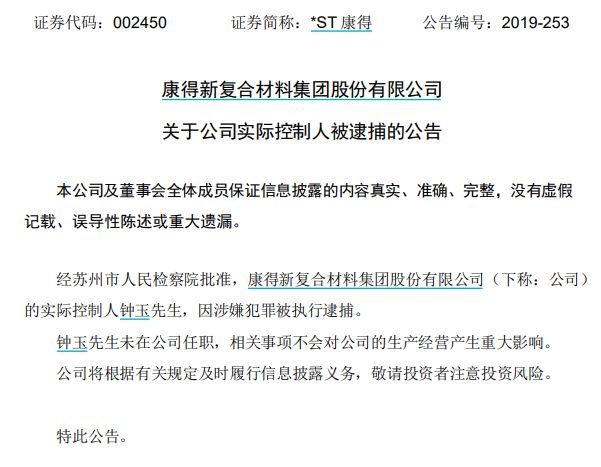 12月16日晚间,*ST康得公告称,经苏州市人民检察院批准,公司实际控制人钟玉因涉嫌犯罪被执行逮捕。对此,*ST康得撇清称,钟玉未在公司任职,相关事项不会对公司的生产经营产生重大影响。