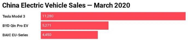 3月特斯拉在华的电动车销售量甚至超越比亚迪。根据EV Volumes统计,3月Model3在华销售1.13万量,销量倍杀排名第二的比亚迪。