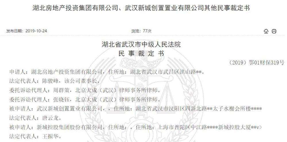 中国裁判文书网曾在2019年10月,公布过一则《湖北房地产投资集团有限公司、武汉新城创置置业有限公司其他民事裁定书》。