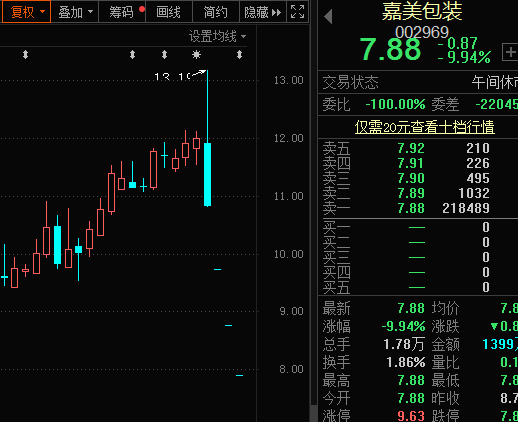 截至今日早盘,嘉美包装再度封死跌停,截至最新,股价已连续4个交易日跌停板,距9月9日最高价已跌去40%。截至中午收盘,嘉美包装跌停板上仍有21.9万手封单,近3日成交量仅2.9万手,与9月9日当天的66万手的交易量相比差距甚远,当天追高买入的投资者深套其中。