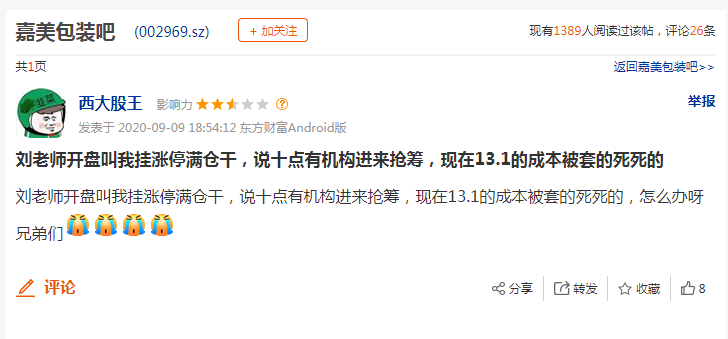 有市场人士表示,该股或因网络直播荐股陷阱,导致出现“杀猪盘”。9月9日,股吧投资者发帖称,有人在网络平台组群直播,大肆鼓动散户投资者买入嘉美包装,甚至表示挂涨停板也可以买!也有投资者发帖称,买了股票就被踢出社交群。网上流传的一段举报网络直播荐股陷阱的视频也显示,正在给观众直播的人士强烈推荐学员买入嘉美包装,9月9日当天,该股涨到3个点后,仍在鼓动学员直接抢筹,并称现在进去连续3天3个板,星期五可以逐步进行减仓。