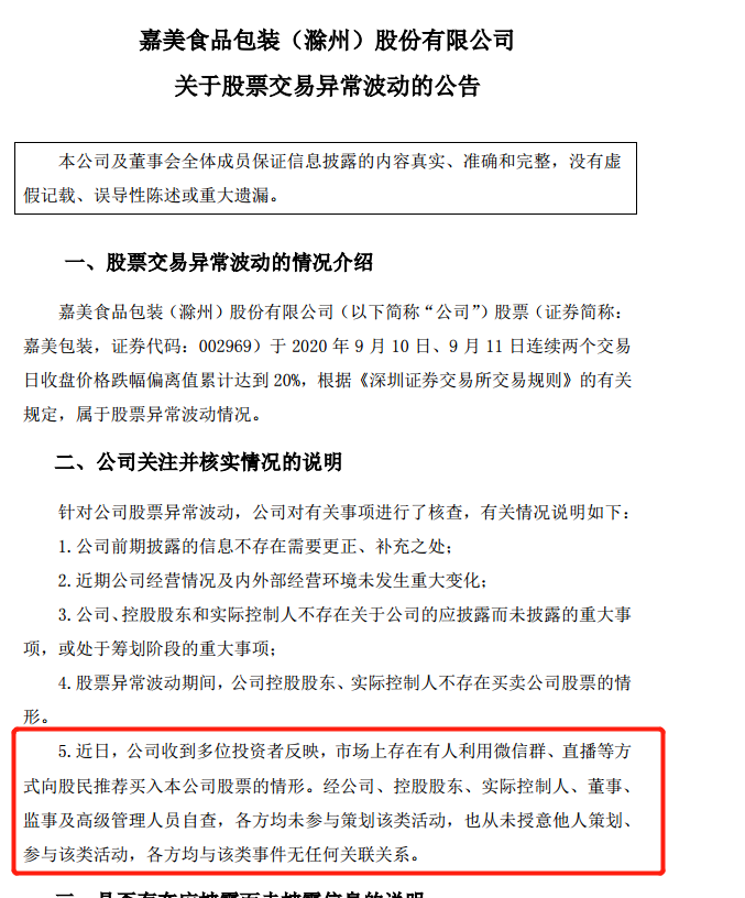 昨日,嘉美包装发布异动公告称,近日,公司收到多位投资者反映,市场上存在有人利用微信群、直播等方式向股民推荐买入本公司股票的情形。经公司、控股股东、实际控制人、董事、 监事及高级管理人员自查,各方均未参与策划该类活动,也从未授意他人策划、 参与该类活动,各方均与该类事件无任何关联关系。