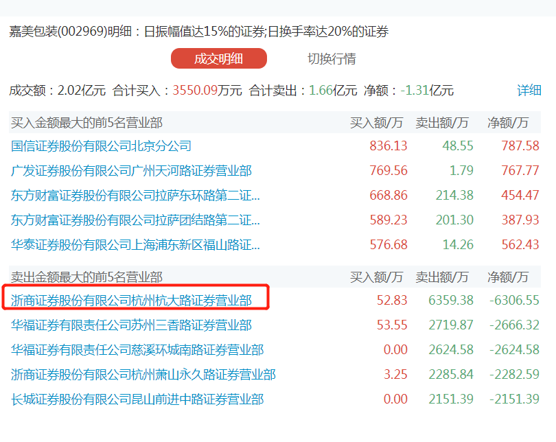 嘉美包装9月9日当天股价在短时间内迅速拉涨停,随后一路下跌,收盘时接近跌停。嘉美包装当日换手率高达69.36%,成交金额8.25亿元。龙虎榜显示,该股买入前5的营业部合计共买入3440万元,其中隐现多个散户投资者居多的席位,卖出前5的营业部合计共卖出1.6亿元,其中卖出金额最大的席位是浙商证券杭州杭大路营业部,卖出6359.38万元,8月27日的龙虎榜显示,此营业部曾在当天买入2113.53万元。