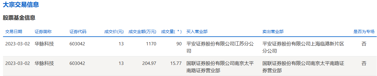 在华脉科技股价持续拉涨停板期间,3月2日,华脉科技发生两笔折价大宗交易,交易价格均为13元。其中,一笔交易数量为90万,交易金额1170万元;另一笔交易数量为15.77万,交易金额204.97万元。