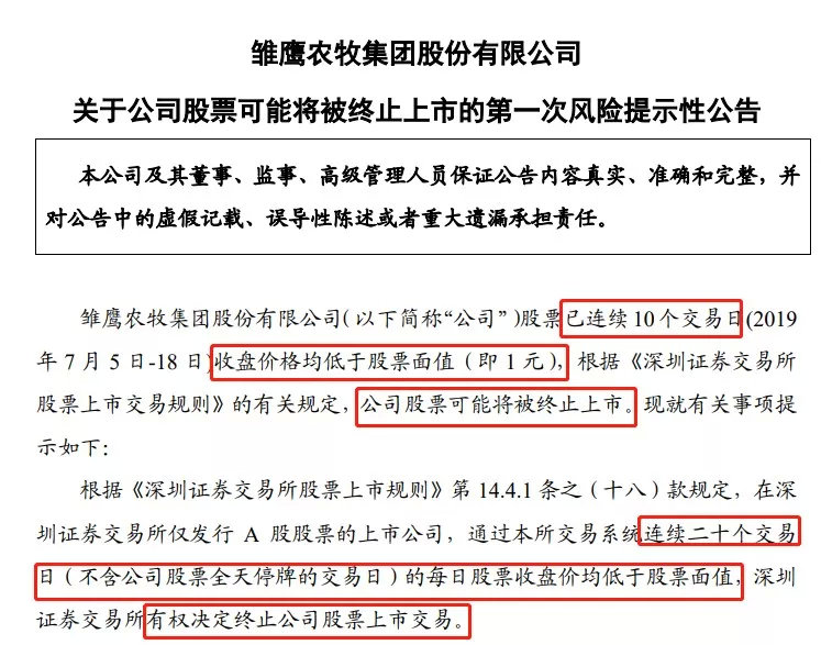 *ST雏牧昨晚公告显示,股票已连续10个交易日(2019 年 7 月 5 日-18 日)收盘价格均低于股票面值(即 1 元),根据深交所有关规定,公司股票可能将被终止上市。