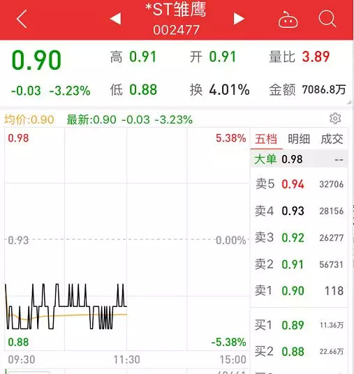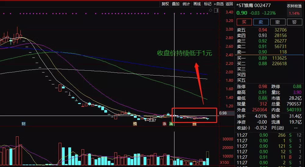今日上午,*ST雏牧又大跌3.23%,收报0.9元,基本可以确定,今日收盘价将继续低于1元面值,又多了1个交易日。
