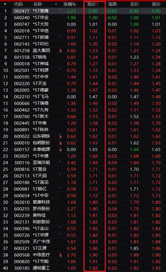 截至今日上午收盘,除*ST雏牧之外,还有48只股票价格低于2元,其中*ST华业、*ST大控、*ST华信的股价分别为1.00元、1.01元、1.02元,这类股票也要防范风险。