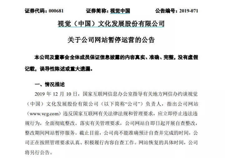 而作为上市公司,对于这一重大事件,视觉中国在12月10日当晚同步发布公告,称公司自即日起开展自查整改,整改期间网站暂停服务。截止目前,视觉中国尚不能准确预计自查并完成的时间,正在按照管理要求认真、积极履行内容自查工作。网站恢复的具体时间,视觉中国将另行公告。