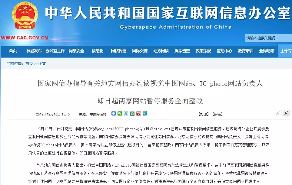 恢复运营仅7个月,视觉中国再遭整改。12月10日,国家互联网信息办公室官方微信公众号“网信中国”发布消息称,针对视觉中国(域名vcg.com)和IC photo(域名dfic.cn)违规从事互联网新闻信息服务等问题,国家网信办指导地方网信办约谈两家网站负责人,责令其立即停止违法违规行为,全面彻底整改。