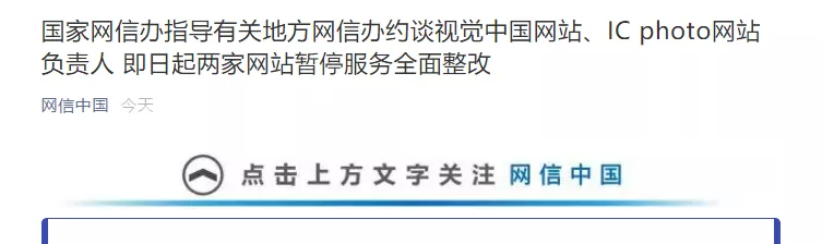 12月10日下午,网信办消息显示,针对视觉中国网站(域名vcg.com)和IC photo网站(域名dfic.cn)违规从事互联网新闻信息服务、违规与境外企业开展涉及互联网新闻信息服务业务的合作等问题,国家网信办指导天津网信办会同江苏网信办、北京网信办约谈视觉中国网站负责人,指导上海网信办约谈IC photo网站负责人,责令两家网站立即停止违法违规行为,全面彻底整改。