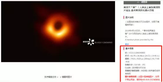 彼时,在视觉中国网站上出现的黑洞照片显示,该图片为编辑图片,并注明此图如用于商业用途,请致电或咨询客户代表。