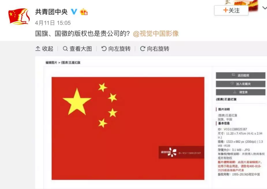 一石惊起千层浪,在网友相继扒出国徽、国旗等图片在视觉中国上也有版权之后,共青团中央官方微博对视觉中国开始了反击,声称“国旗国徽的版权也是贵公司的?”。这一行为随后遭到了中国警察网、紫光阁等多家官方微博的质疑,更有调侃称,“世界是你们的,也是我们的,但是归根结底是视觉中国的。”