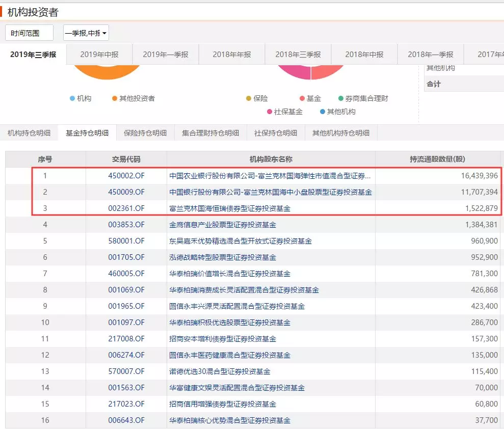 有意思的是,交银施罗德基金在踩雷后,二季度大举出逃,此时国海富兰克林基金的3只产品却大幅加仓近3600万股,虽然3只基金产品在三季度进行了减仓,但截至三季度末,国海富兰克林基金仍持有近3000万股。