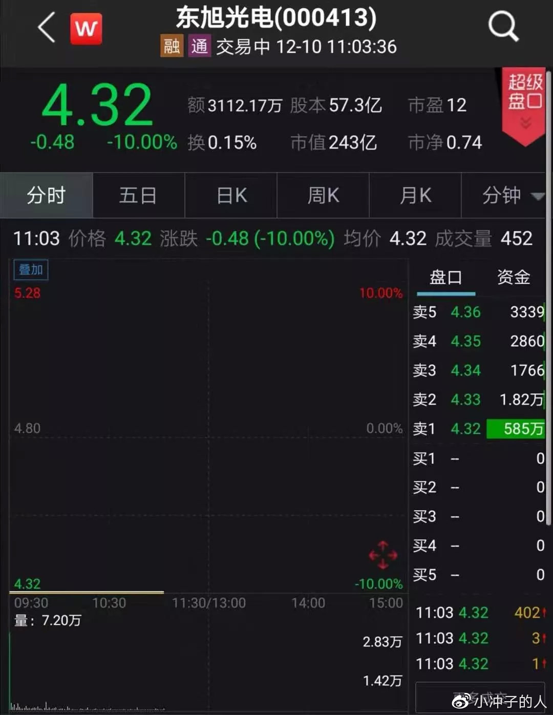 12月10日早盘,东旭光电毫无悬念一字跌停,短短半个小时的时间,抛售资金不断增加,巨量卖盘排队等待卖出。