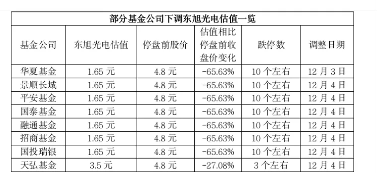 自11月19日起开始停牌的东旭光电,华夏、天弘、招商、平安、国泰、景顺长城、融通、国投瑞银等多家基金公司纷纷发布公告称,对公司旗下基金持有的东旭光电进行估值调整。