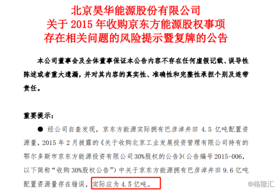 一是在收购30%股权公告中,披露配置给京东方能源位于巴彦淖井田的煤炭资源量为9.6亿吨,与京东方能源实际拥有4.5亿吨资源量不一致,2015年收购30%公告中资源量披露错误。