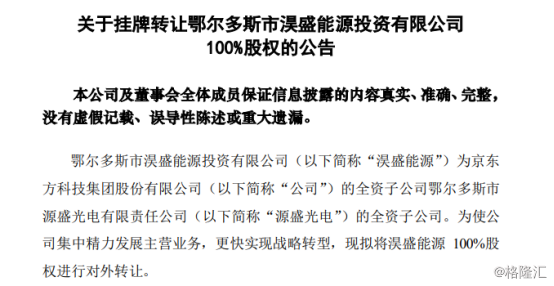 12月26日,也就是昊华能源自揭大雷的前一天,京东方A发布了一项转让公告。公告显示,京东方A拟出售的全资子公司淏盛能源100%股权,而这一子公司则具有巴彦淖井田9.6亿吨资源中5.1亿吨配置。