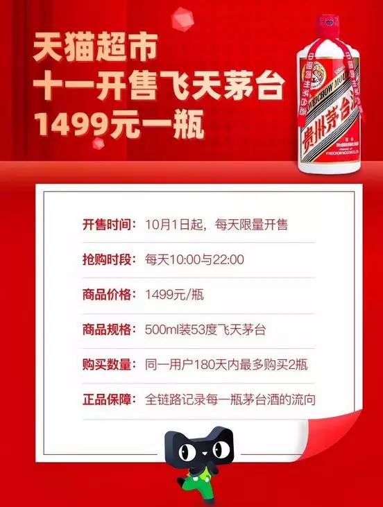 9月30日,天猫超市宣布国庆期间开售茅台。10月1日起,每天10时和22时,500ml装53度飞天茅台将以1499元/瓶的价格在天猫超市限量开售。