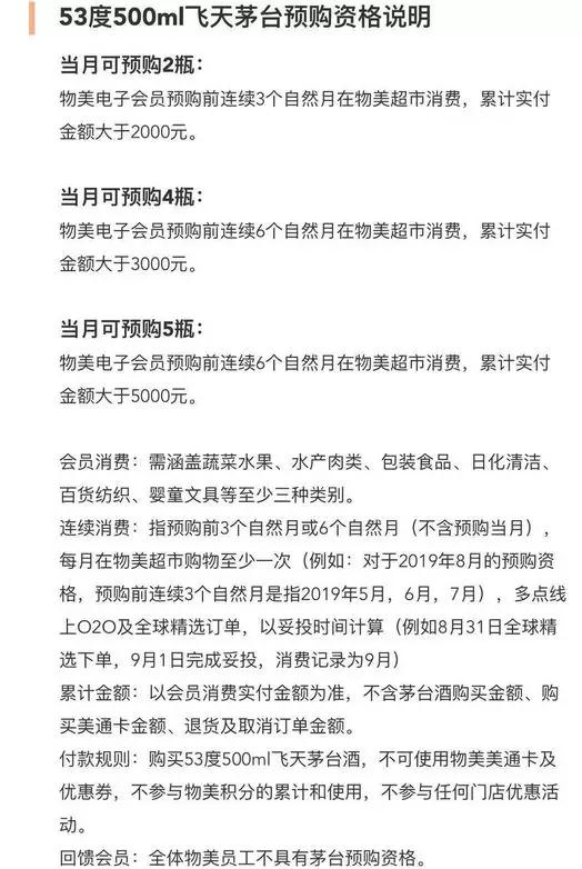 物美表示,本次活动主要为了回馈物美会员。国庆惠民活动以如下形式进行:一是,只要是2019年8月31日(含)前注册的物美电子会员,且在2018年1月1日至今有白酒购买记录,即可获得2瓶53度500ml飞天茅台酒的“国庆专享预购资格”;二是,凡10月1日出生的物美电子会员,只要年满18周岁(即2000年及以前年份的10月1日出生),在多点APP上传身份证通过验证后就可获得2瓶53度500ml飞天茅台酒购买资格。
