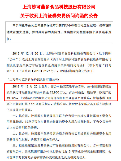 就在去年12月底,妙可蓝多自曝“危机”,其在自查中发现,公司控股股东柴琇及关联方非经营性占用公司资金2.4亿元,占公司最近一期经审计净资产的19.66%。随后妙可蓝多便收到了上交所的问询函,要求公司对相关事项进行详细解释。