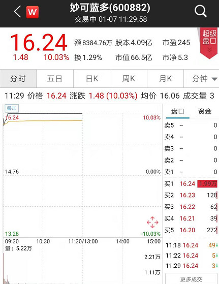 1月7日早盘开盘,妙可蓝多果然涨停。开盘后,股价小幅高开后,不到10分钟就冲上涨停板。截至午盘收盘,妙可蓝多报收16.24元,近2万手买单封在涨停板上。