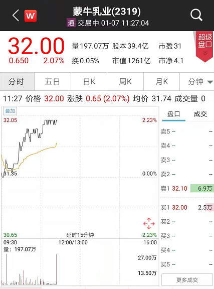 在港股市场,蒙牛乳业H股也出现了明显上涨行情。当天早盘开盘,蒙牛乳业股价小幅震荡后,开始出现上攻态势。十点以后,股价开始出现上涨行情,涨幅达1.75%。截至11点30左右,蒙牛乳业港股报收32港元,涨幅1.59%,总市值达1263亿港元。