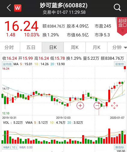1月7日早盘开盘,妙可蓝多股价高开高走,不到十分钟,股价就强势冲上涨停。截至午盘收盘,妙可蓝多报收16.24元,约2万手买单封在涨停板上,总市值达66亿。