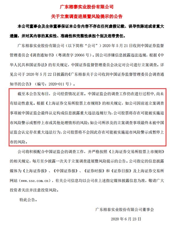 而在股民们更为关注的涉嫌信披违规方面,广东榕泰也对立案调查进展和风险提示进行了公告: