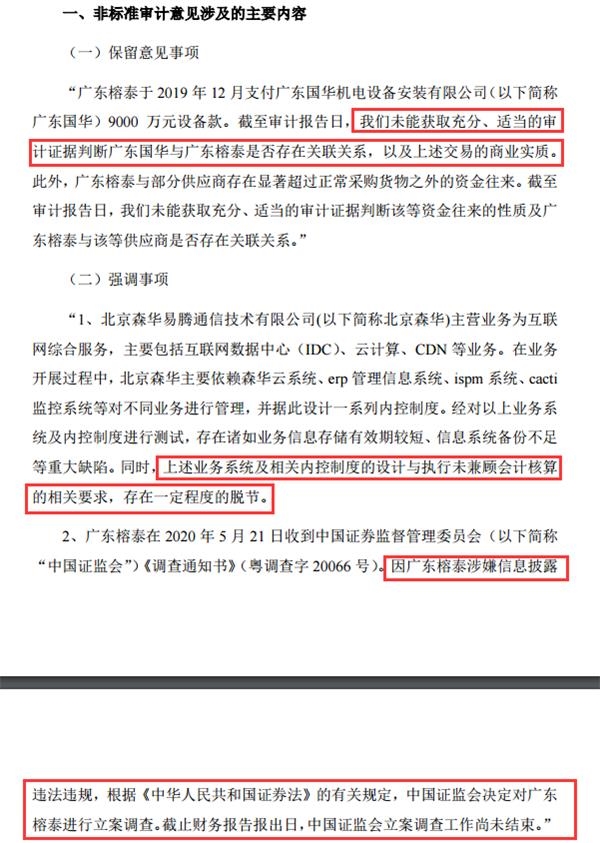另外更重要的是:广东榕泰2019年度财务报告被大华会计师事务所出具了大华审字[2020]0011513号保留意见的审计报告。