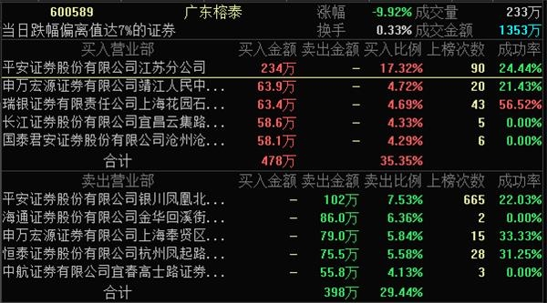 盘后龙虎榜显示,平安证券的两个营业部成为广东榕泰最大的买家和卖家,前五席位合计净买入约80万元。
