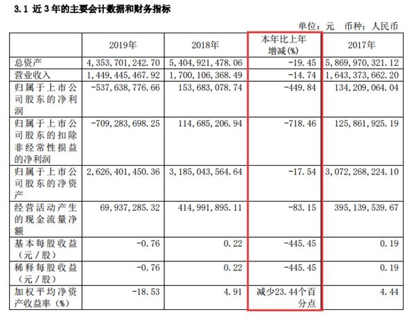 其中,年报的情况可谓“触目惊心”,2018年公司还处于盈利状态,但2019年即告巨额亏损:2019年营业收入同比下滑14.74%;净利润同比下滑450%;扣非净利润更是同比下滑718%。