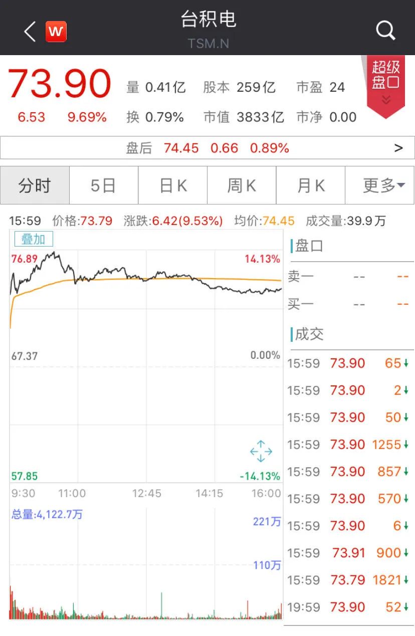 截至当地时间周五收盘,芯片巨头——中国台湾的台积电(TSM)股价暴涨近10%,市值暴涨近3000亿元。