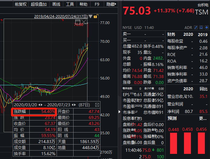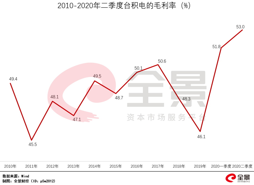 其中,2020年二季度台积电的毛利率高达53%,飙出历史新高。