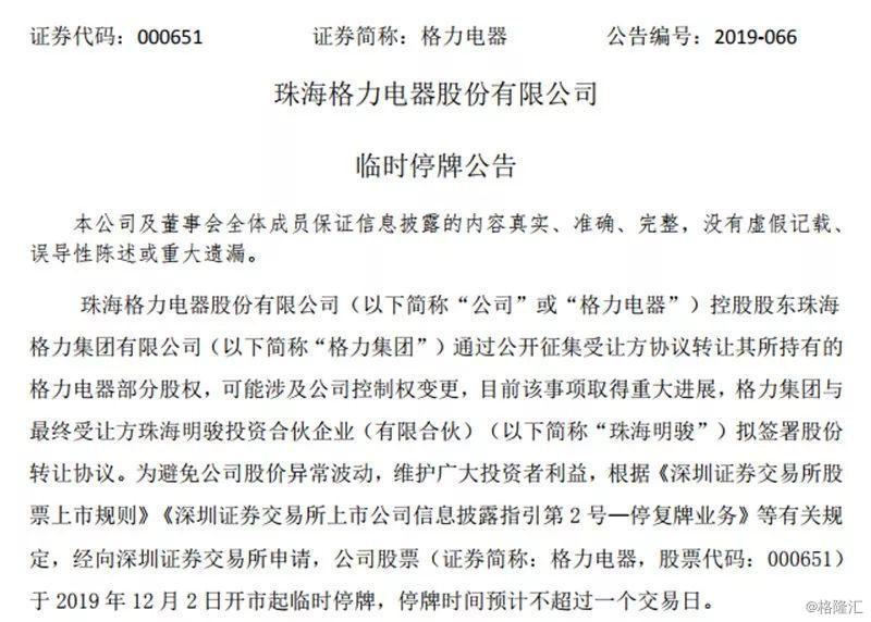 就在外界传言认为,此次股权转让出现“重大变化”而非“重大进展”之际,当日午间,格力电器发布公告称,格力集团与最终受让方珠海明骏拟签署股份转让协议,停牌时间预计不超过一个交易日。