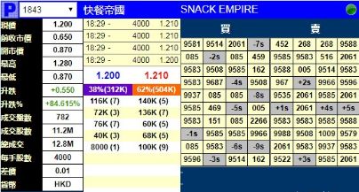 辉立证券暗盘交易显示,上市前夕,快餐帝国收报1.20港元,较招股价0.65港元涨84.615%。每手4000股,不计手续费,每手能赚2200港元。