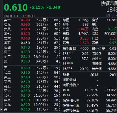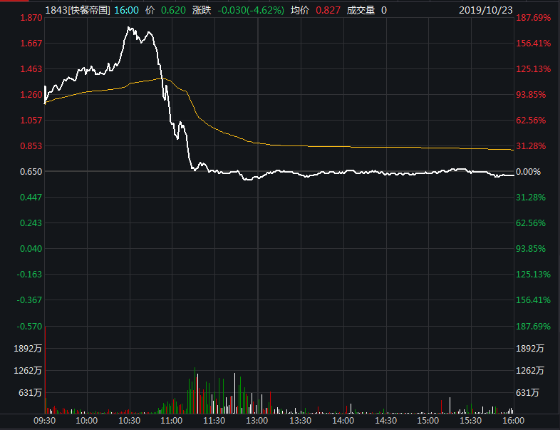 下午开盘后,快餐帝国继续颓势,股价在发行价0.65港元附近徘徊。截至收盘,其报收0.610元,跌幅6.15%。全天换手率高达71.78%,振幅达到200%。