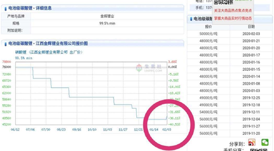 新浪财经查询电池级碳酸锂近年售价走势后看到,2017年下半年至2018年初,电池级碳酸锂价格基本处于16万元/吨至17万元/吨之间,为历史高位,此后一路下跌。