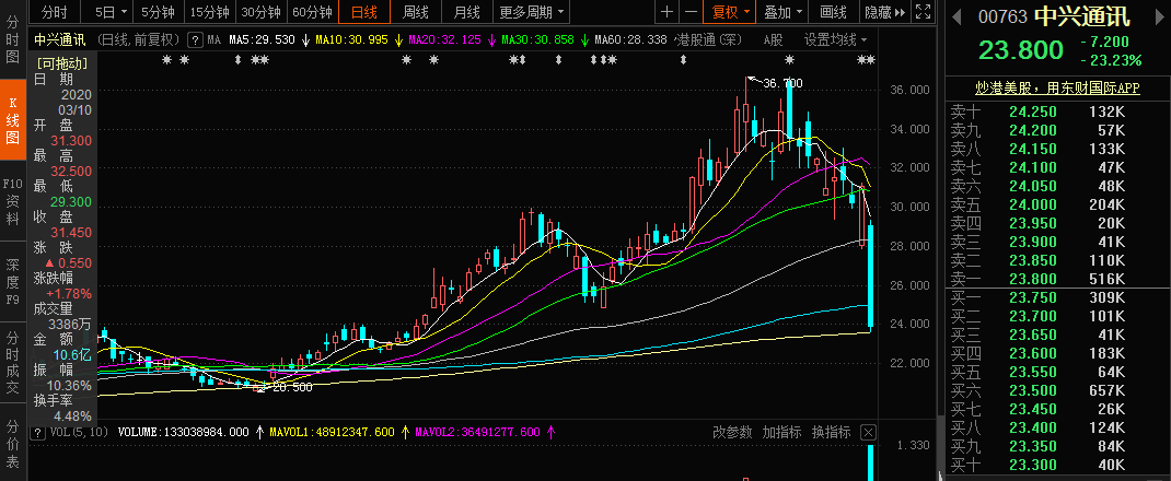 3月16日,受上述传闻影响,中兴通讯A股一早出现跌停,H股也未能幸免。