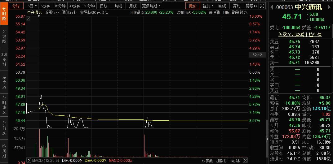 当日,中兴通讯A股收盘于45.71元/股,下跌10%,换手率8.89%;H股收盘于23.8港元/股,大跌23.23%,创下中兴通讯H股今年以来新低。中兴通讯A股市值蒸发约234亿元、H股市值蒸发约331.9亿港元。