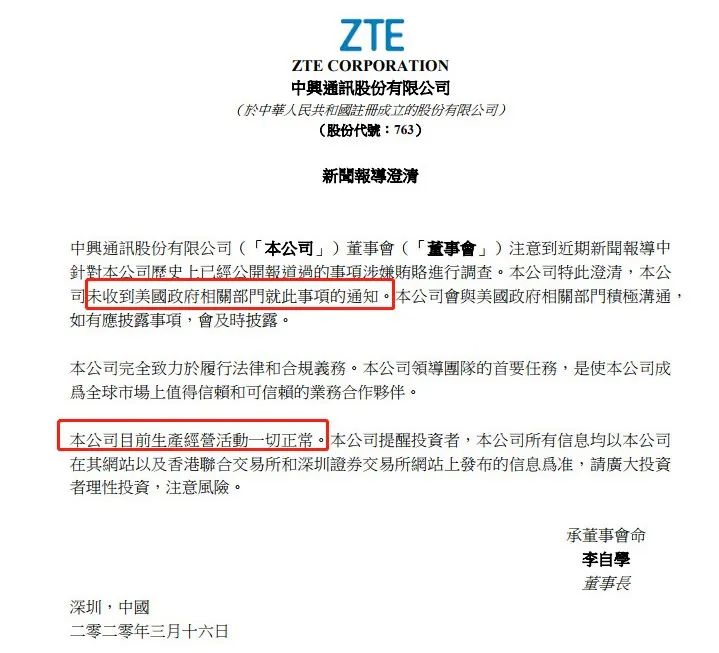 3月16日12时54分,中兴通讯在港交所发布澄清公告称,董事会注意到近期新闻报导中针对公司历史上已经公开报道过的事项涉嫌贿赂进行调查。